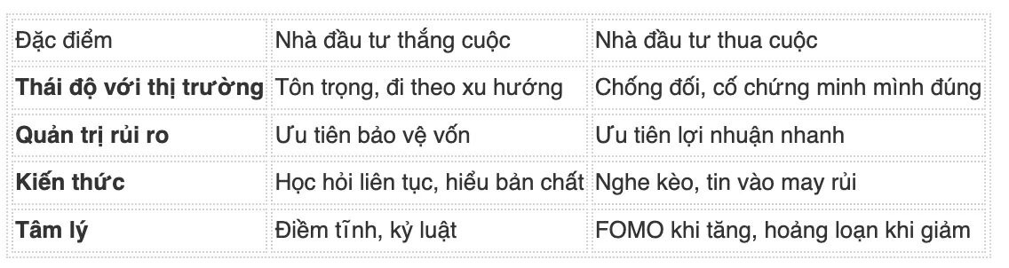 Bảng so sánh tư duy Nhà đầu tư thắng cuộc và Nhà đầu tư thua cuộc: